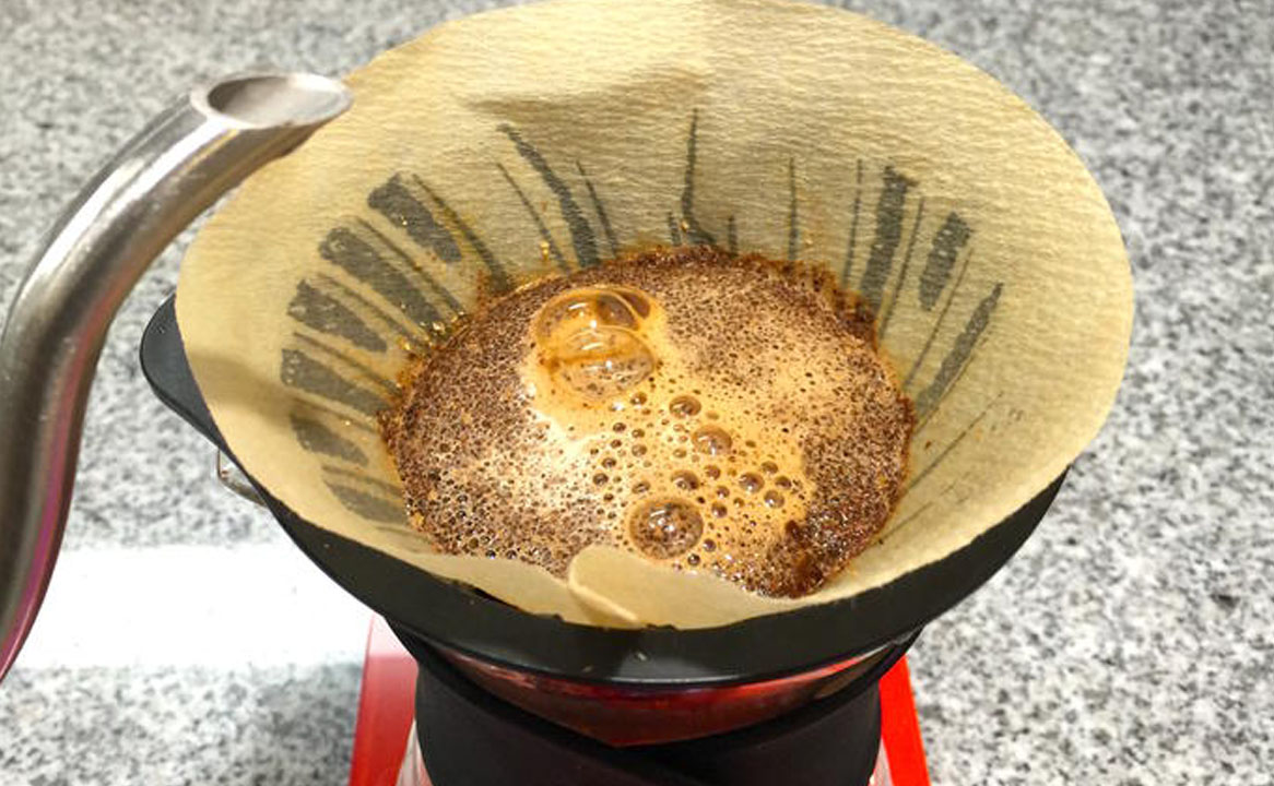 • Imediatamente antes da fervura (90ºC), despeje a água sobre o pó, umedecendo-o todo. Comece molhando o pó de café das beiradas para o centro do coador/filtro. Em seguida, despeje a água lentamente (em fio) bem no centro do filtro, sem misturar com a colher.